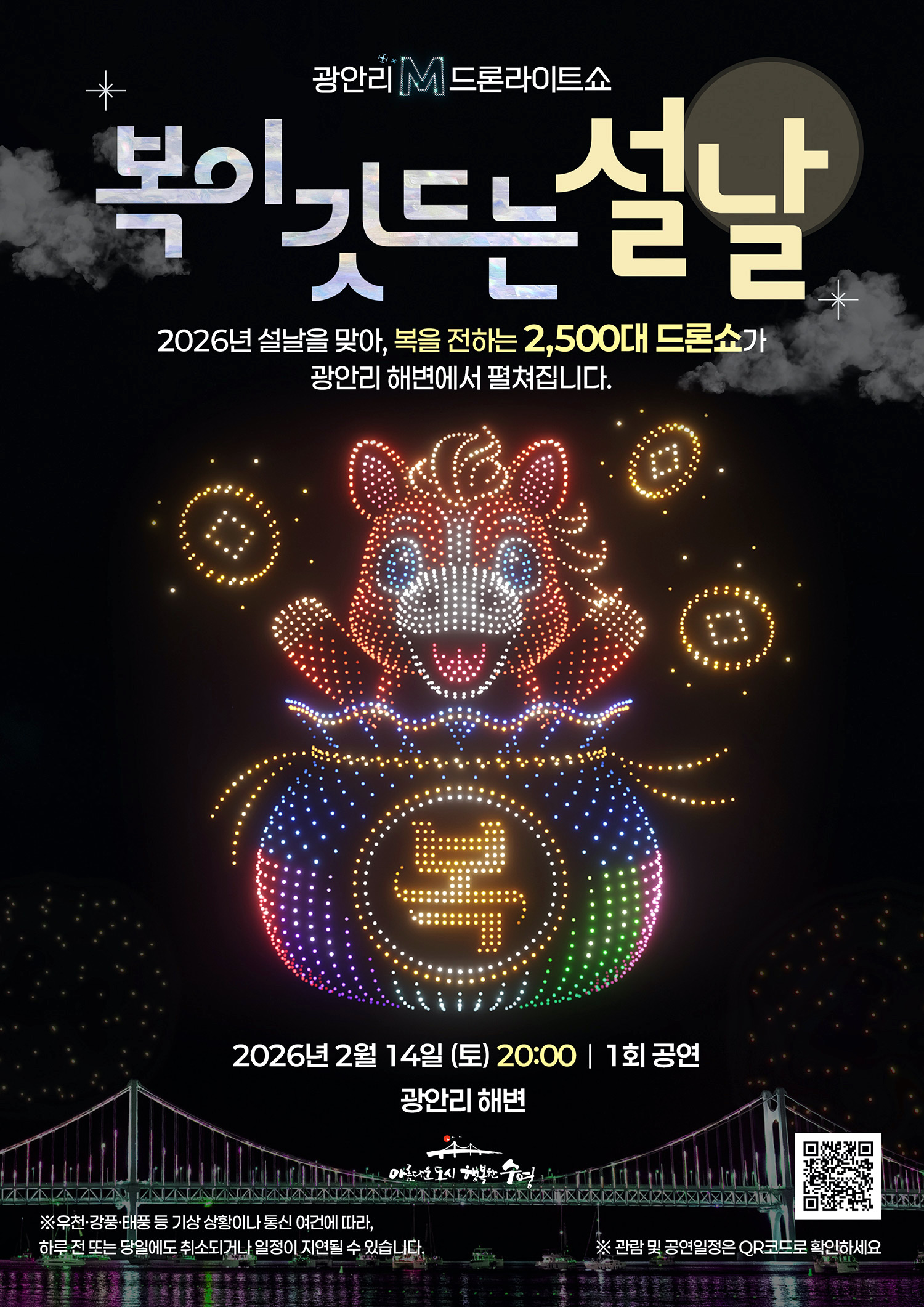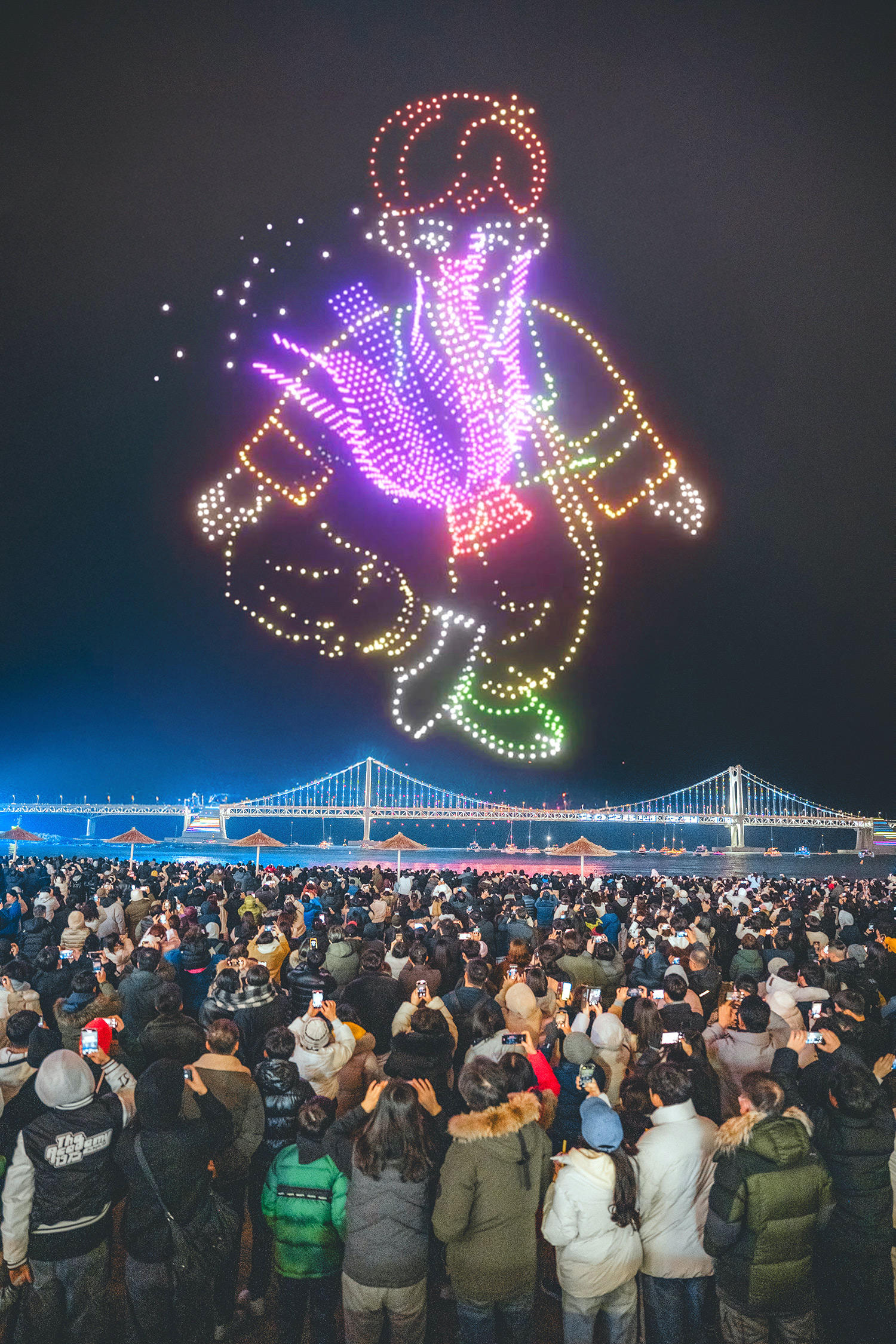 広安里の人気コンテンツ「広安里Mドローンライトショー」。毎週土曜日の夜、広安里海水浴場を舞台に、さまざまなテーマでダイナミックで華麗なショーを公演。2月14日はソルラル(旧正月)を祝うイベントとして、2500台のドローンによる特別公演が開催される。