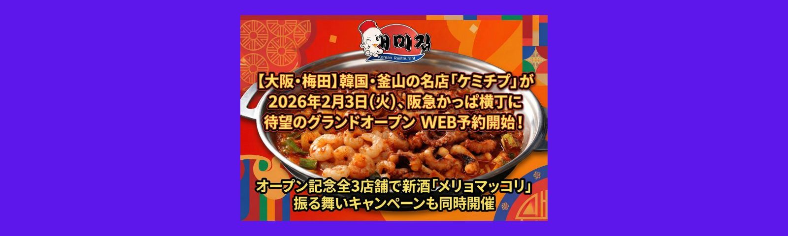 釜山のナッコプセの老舗ケミチプ(Gaemizib)では鶴橋本店、難波千日前店に続き、2月3日(火)に「ケミチプ阪急かっぱ横丁店」をオープンする。阪急かっぱ横丁は有名なグルメスポットで、アクセスの良さもポイントだ。釜山の食堂にいるような活気ある空間で、独特の食感と辛さが魅力のナッコプセが味わえる。