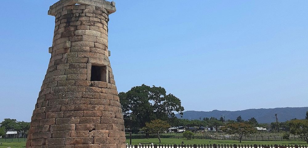 善徳女王時代に建造したとされる、東洋最古の天文台「慶州 瞻星台」(国宝第31号)。花崗岩を使った円筒状の建築物で、頂部には井の字型の石が組まれている。高さは約9mで、地上から外はしごで登り、中間にある窓から内部に入り、内部のはしごで頂部に出て、天体観測をしたと推測される。上部が丸く下部は四角い形状は、天と地を形象化したものといわれ、建築には一年をあらわす365個前後の石が使われているという。大陵苑のそばにあり、慶州定番の観光コースなっている。