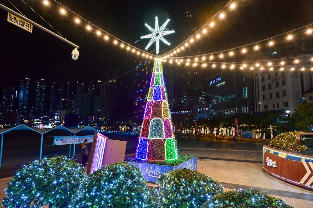 釜山の観光スポットのひとつ、松島エリア。現在、西区では松島海水浴場一帯、九徳運動場や忠武洞交差点周辺で「西区 希望の光通り서구 희망의 빛거리」を開催中。カラフルな光のオブジェや輝くイルミネーションが冬の松島を美しく彩っている。