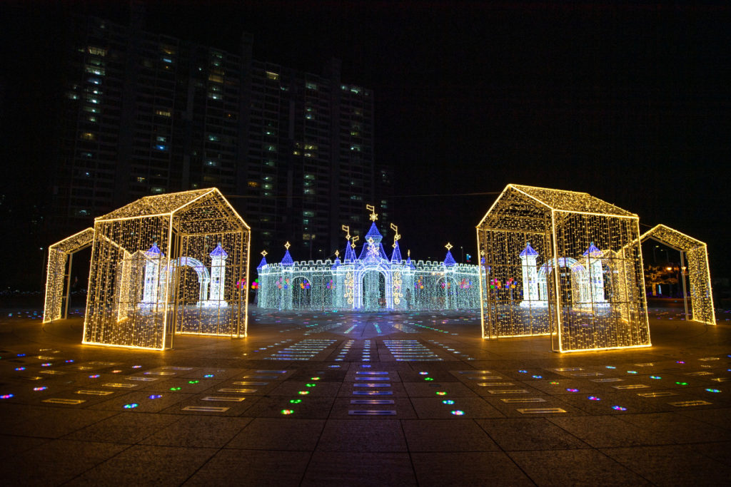 毎年、春から秋にかけて実施する「多大浦 夢の落照噴水ショー」が人気の多大浦。現在、噴水がある多大浦海浜公園広場一帯では、White Paradaise in DADEPOをテーマに「多大浦落照噴水 光通り」を開催中。期間中、イベント「雪が降る夢の落照噴水」を実施し、雪が舞う夢のような世界を演出する。